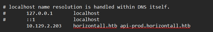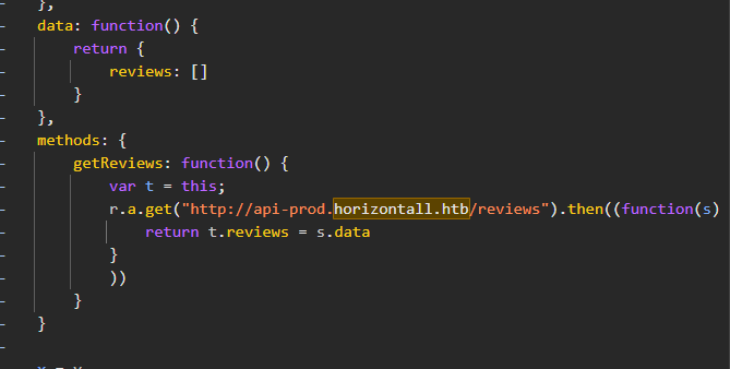 We can try vhosts scan or look at the source of the web app, specifically into .js files and see if there are some clues left there. Inspecting the app.c68eb462.js file we search for horizontall.htb string hoping for some possible endpoints we can examine and we finally get a hit!! It appears that there is a subdomain api-prod.horizontall.htb/