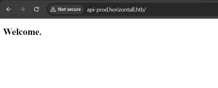 Going to the ‘http://api-prod.horizontall.htb/’ we are greeted with a simple “Welcome” message.