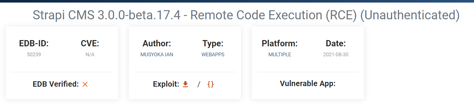 What we are going to do first though is look up if there are any known vulnerabilities in the strapi. After quick google search we can see that there is an exploit for Strapi CMS 3.0.0-beta.17.4 in exploit db.