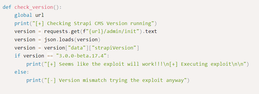 However at this point in time we aren’t really sure what is the version of our strapi. Scrolling through the exploit code we can see that there is a version check before an exploitation attempt is made. We can see that in here.