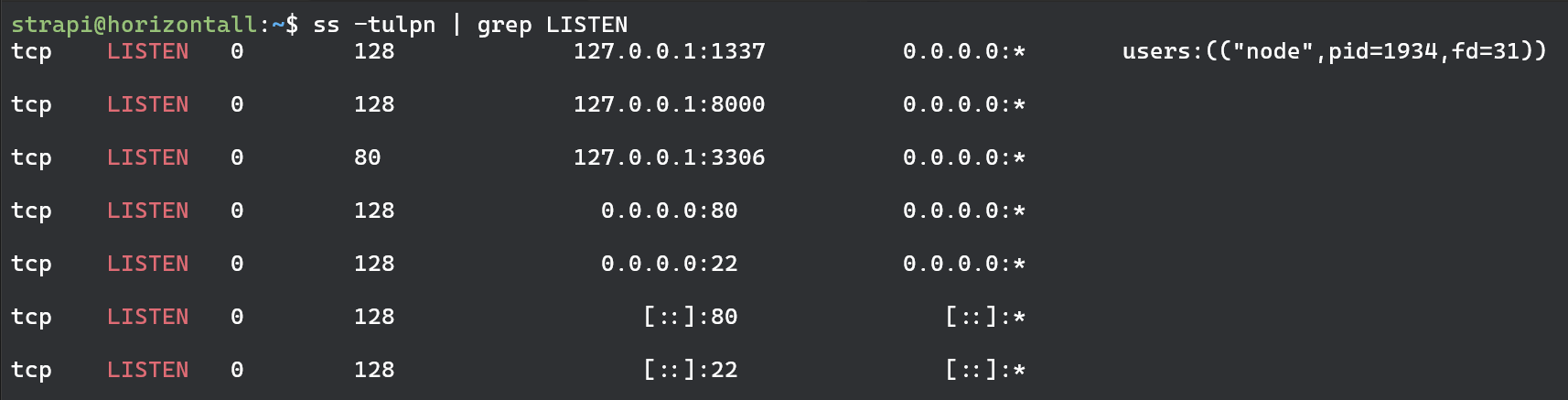 We can see that besides the us there is also a developer and root user. Next lets see what ports are listening on our box.