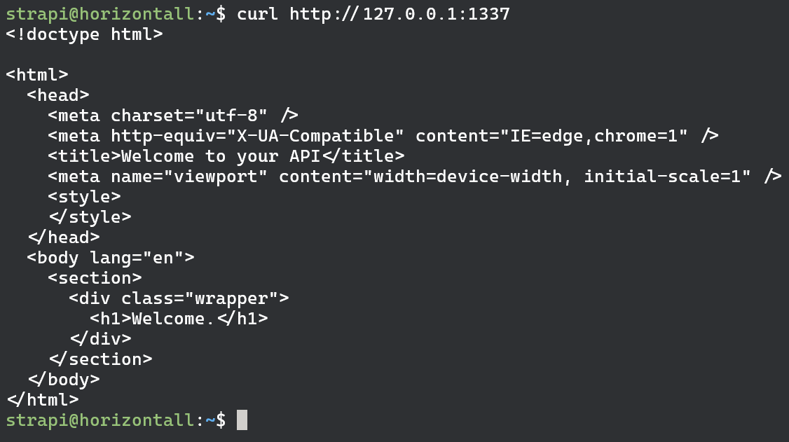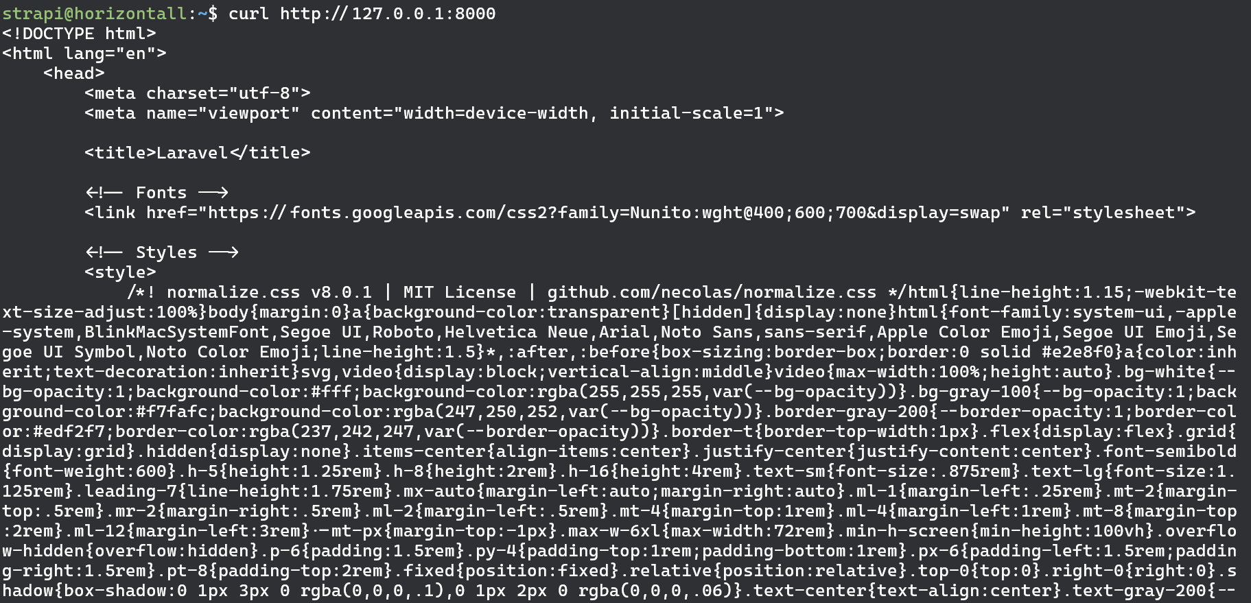 We have couple of ports listening. Port 22 and 80 we can exclude since we already know what those are. Same goes for port 3306 as its MySQL database for strapi web app. We could try extracting database username and password from the source code which we may eventually. However at this point i wanna see what’s up with ports 1337 and 8000. So what we are going to do first is simply curl those addresses and see we we get any http response from them.