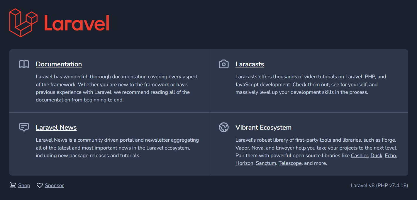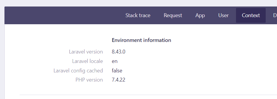 This time we have a laravel default welcome page. A quick google search for laravel on hacktricks and there is couple of interesting things for us to try. Going to /profiles shows us an error page indicating that laravel is running in debug mode. Exploring context tab on the error page tells us that the laravel version is 8.43.0 which seems to be vulnerable to RCE that we found on hacktricks.